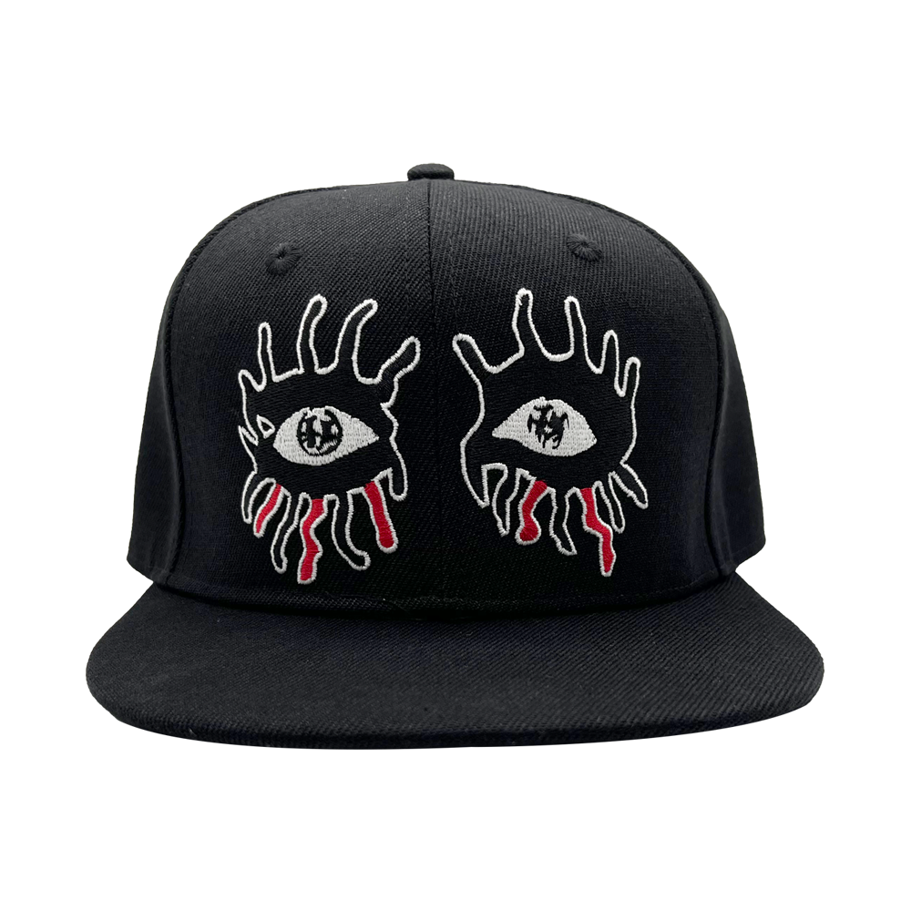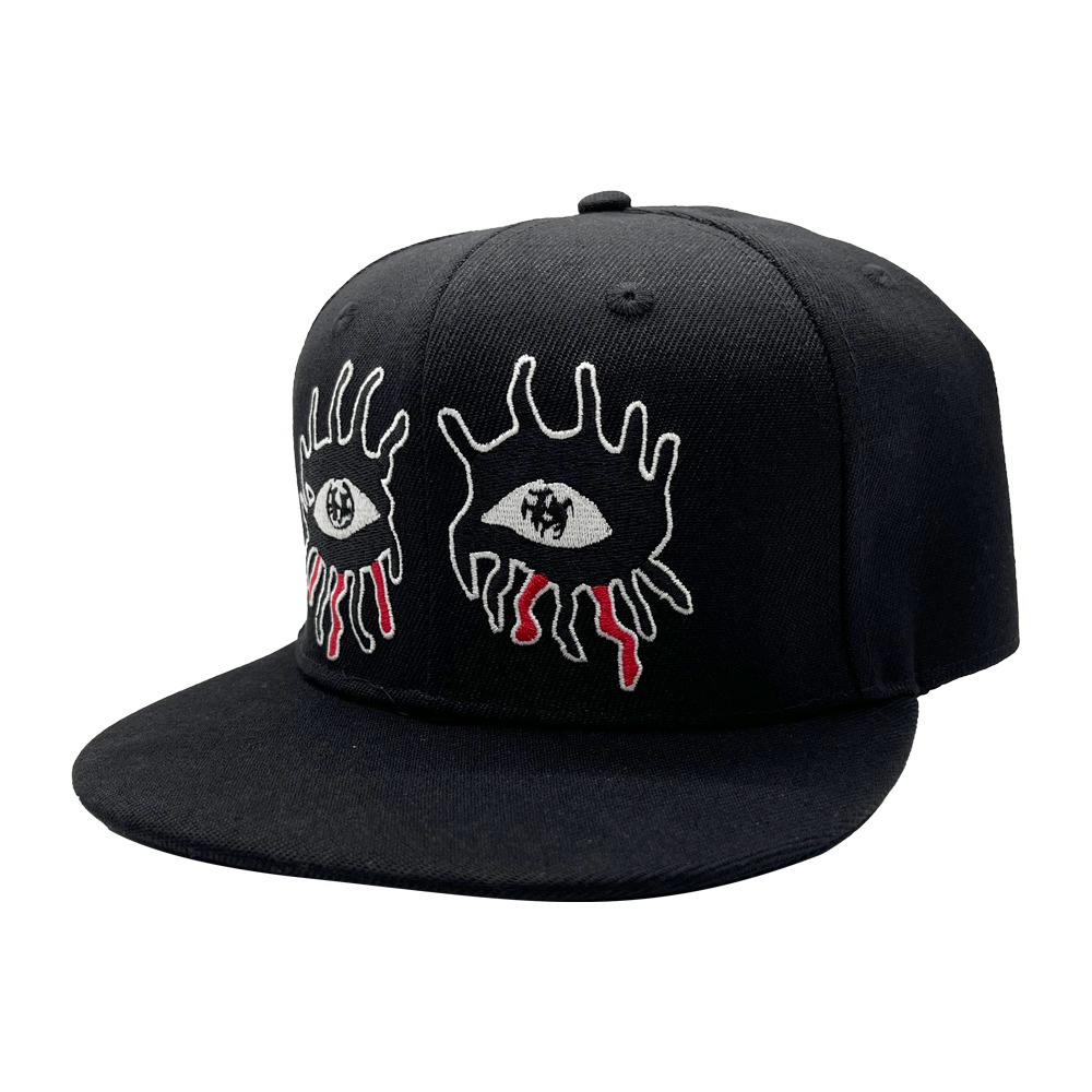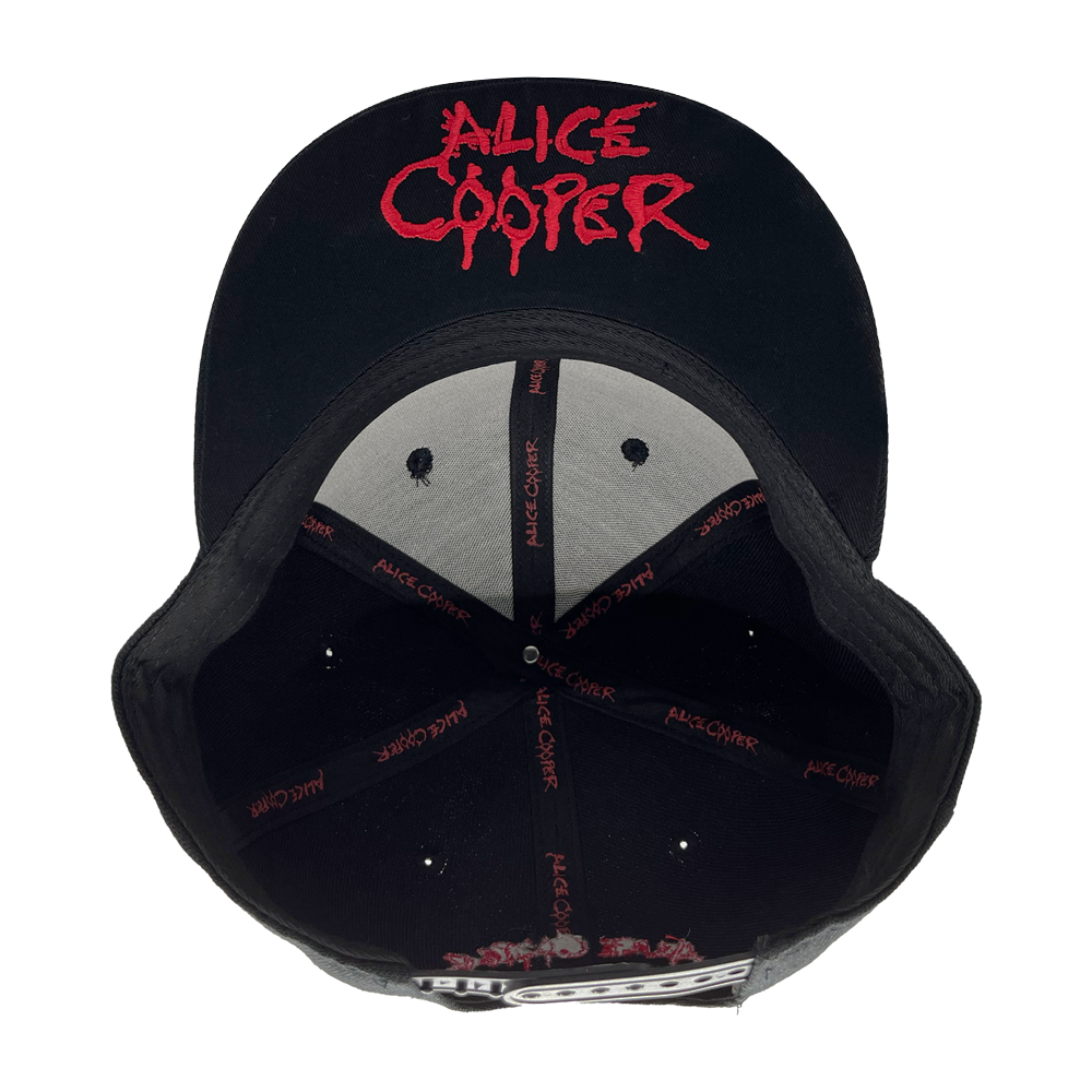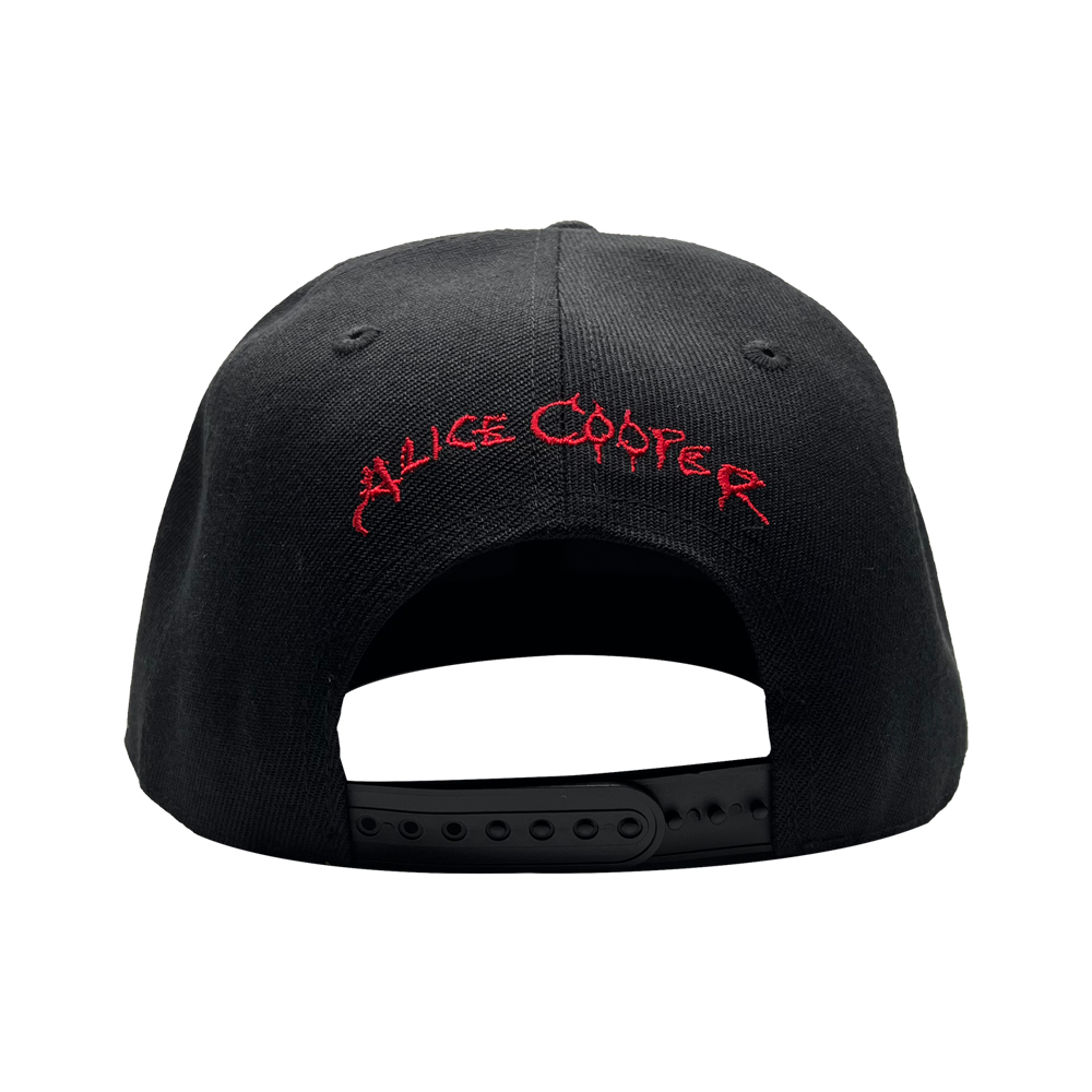 The Embroidered Eyes Hat by Alice Cooper is an adjustable cap with an embroidered Alice Cooper logo on the front and classic black eyes artwork on the reverse.